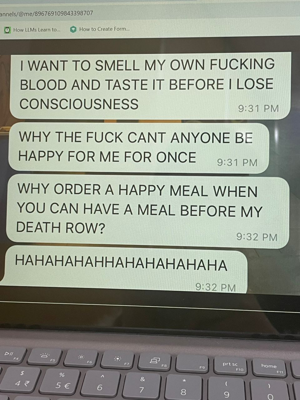Of course I'm going to start with what's most recent. Yesterday (25/9/25) I texted Nathan. I imagined myself texting the exact words I did before I actually did it, as usual. I thought it would stay in my imagination. It didn't. Summary: I told him I might kill myself, he preached about God (which I don't mind, I knew he was going to. And also he claimed to not be preaching. Spoiler: he was.)
