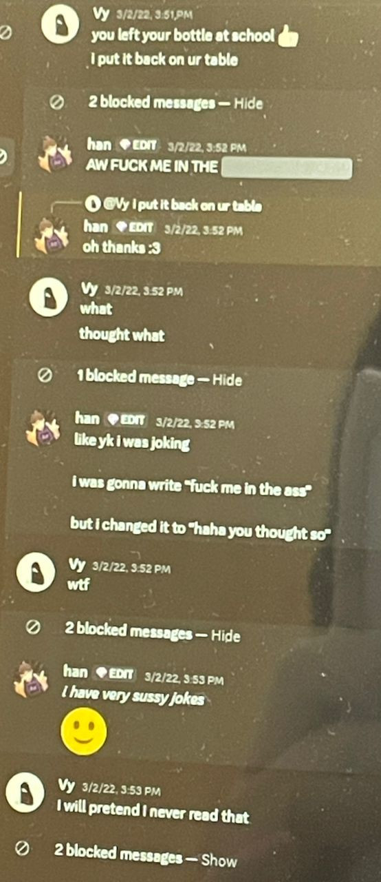 After that, the discipline teacher announced over the speakers that I was missing and she quickly ran down the stairs. I didn't really care, I just took the chance to quickly get home too. I ended up walking faster, and at the gate, her mom was talking to mine, and I arrived first at the scene. When she arrived there too, she immediately yelled, "No, mom! I didn't call Vyonnie an idiot!" and I started laughing at her because she just confessed? She did it because she thought I told on her.